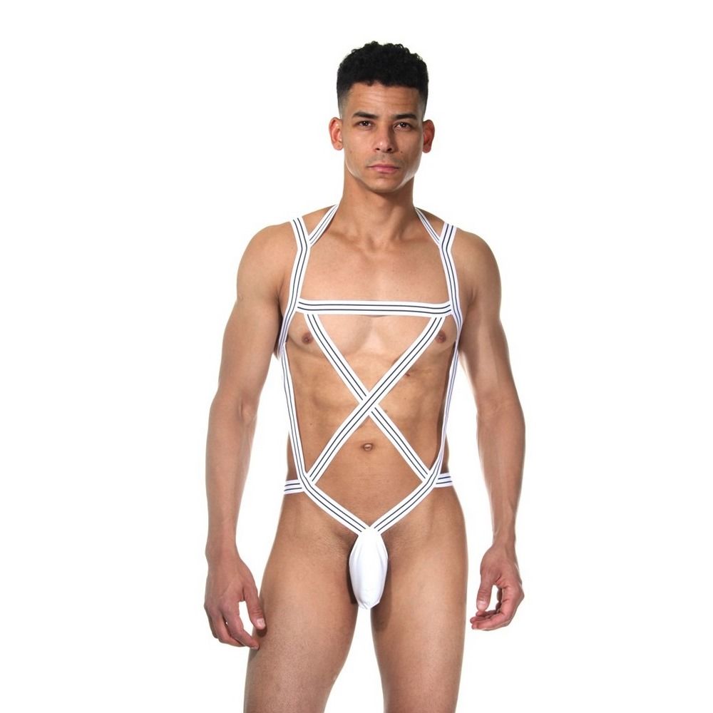 Сексуальное боди для мужчин. Бело-черные широкие резинки оплетают тело. Гульфик белого цвета из гладкого плотного материала.
