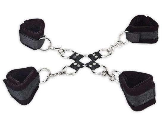 Комплект для сковывания из 5 предметов: 4 мягких браслетов на липучках с металлическими карабинами и соединительная часть с кольцами. Все браслеты можно использовать отдельно - как наручники или оковы для лодыжек, либо попарно соединять конечности. А соединительное звено поможет надежно и комфортно зафиксировать руки и ноги партнера одновременно. One size.