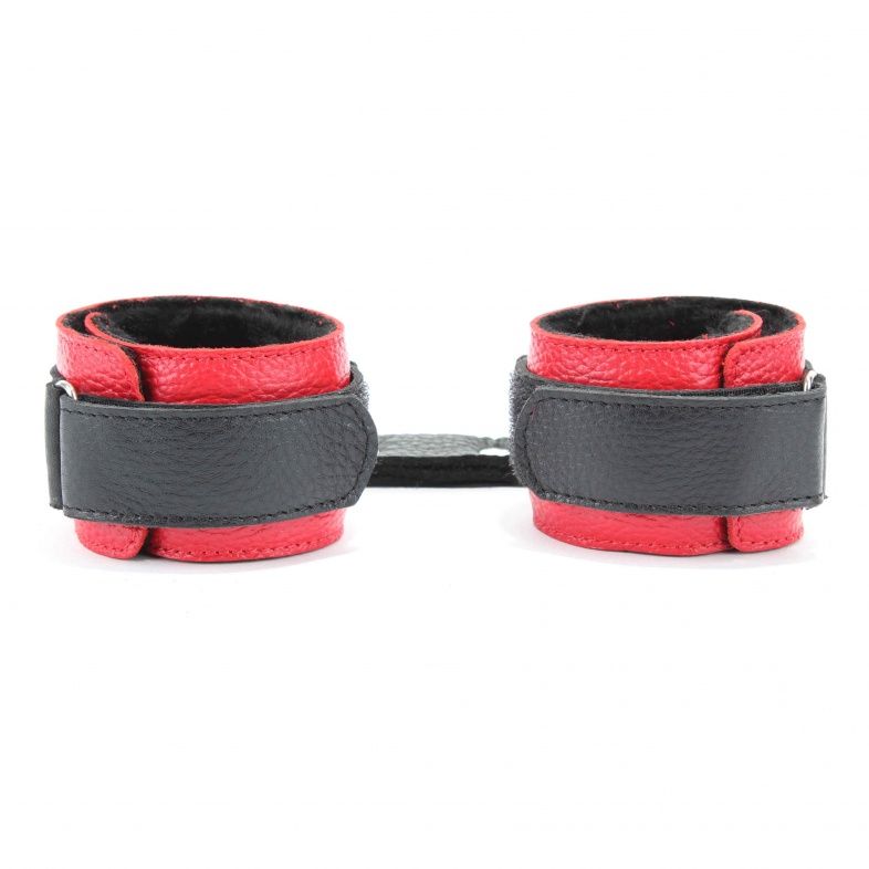 Кожаные наручники красного цвета. Украшены заклепками и соединяются между собой цепью с карабинами. Имеет вставку черного цвета на лицевой части и отделаны мехом с внутренней части. Размер наручников регулируется при помощи застежки-липучки. Ширина - 5 см. Длина цепочки - 15,5 см.