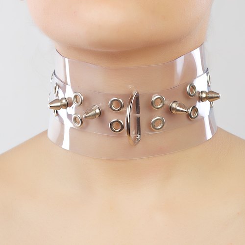 Ошейник изготовлен из пленки ПВХ. При изготовлении использована никелированная фурнитура. Размер универсальный. Ширина - 6,5 см. Длина шипов - 1,2 см.